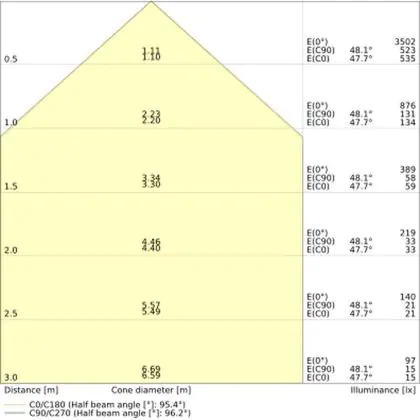 Der Abstrahlwinkel bezeichnet den Winkel, in dem das Licht aus der Lichtquelle ausgestrahlt wird. Er wird in Grad (D) angegeben. Je geringer die Gradzahl des Abstrahlwinkels ist, desto kleiner ist auch der Durchmesser des Lichtkegels, den die Lichtquelle produziert. Beispiel: Wird eine Lampe mit einem Abstrahlwinkel von 60 Grad an der Decke (2,5 m Höhe) angebracht, erzeugt sie einen Lichtkegel von 2,9 Metern Durchmesser. Hat die Lampe hingegen einen Abstrahlwinkel von 120 Grad, beträgt der Lichtkegel 8,7 Meter im Durchmesser. |