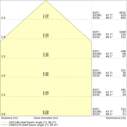 Der Abstrahlwinkel bezeichnet den Winkel, in dem das Licht aus der Lichtquelle ausgestrahlt wird. Er wird in Grad (D) angegeben. Je geringer die Gradzahl des Abstrahlwinkels ist, desto kleiner ist auch der Durchmesser des Lichtkegels, den die Lichtquelle produziert. Beispiel: Wird eine Lampe mit einem Abstrahlwinkel von 60 Grad an der Decke (2,5 m Höhe) angebracht, erzeugt sie einen Lichtkegel von 2,9 Metern Durchmesser. Hat die Lampe hingegen einen Abstrahlwinkel von 120 Grad, beträgt der Lichtkegel 8,7 Meter im Durchmesser. |