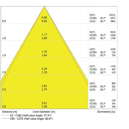 Der Abstrahlwinkel bezeichnet den Winkel, in dem das Licht aus der Lichtquelle ausgestrahlt wird. Er wird in Grad (D) angegeben. Je geringer die Gradzahl des Abstrahlwinkels ist, desto kleiner ist auch der Durchmesser des Lichtkegels, den die Lichtquelle produziert. Beispiel: Wird eine Lampe mit einem Abstrahlwinkel von 60 Grad an der Decke (2,5 m Höhe) angebracht, erzeugt sie einen Lichtkegel von 2,9 Metern Durchmesser. Hat die Lampe hingegen einen Abstrahlwinkel von 120 Grad, beträgt der Lichtkegel 8,7 Meter im Durchmesser. |