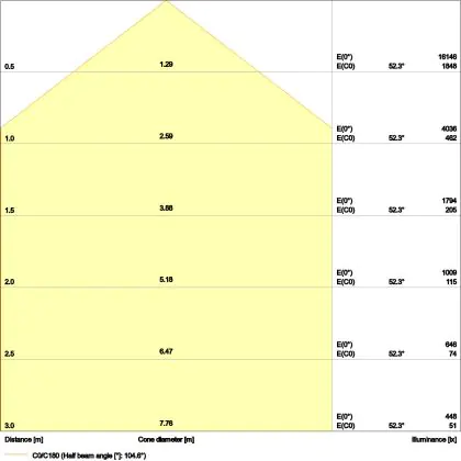 Der Abstrahlwinkel bezeichnet den Winkel, in dem das Licht aus der Lichtquelle ausgestrahlt wird. Er wird in Grad (D) angegeben. Je geringer die Gradzahl des Abstrahlwinkels ist, desto kleiner ist auch der Durchmesser des Lichtkegels, den die Lichtquelle produziert. Beispiel: Wird eine Lampe mit einem Abstrahlwinkel von 60 Grad an der Decke (2,5 m Höhe) angebracht, erzeugt sie einen Lichtkegel von 2,9 Metern Durchmesser. Hat die Lampe hingegen einen Abstrahlwinkel von 120 Grad, beträgt der Lichtkegel 8,7 Meter im Durchmesser. |