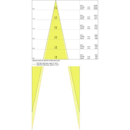 Der Abstrahlwinkel bezeichnet den Winkel, in dem das Licht aus der Lichtquelle ausgestrahlt wird. Er wird in Grad (D) angegeben. Je geringer die Gradzahl des Abstrahlwinkels ist, desto kleiner ist auch der Durchmesser des Lichtkegels, den die Lichtquelle produziert. Beispiel: Wird eine Lampe mit einem Abstrahlwinkel von 60 Grad an der Decke (2,5 m Höhe) angebracht, erzeugt sie einen Lichtkegel von 2,9 Metern Durchmesser. Hat die Lampe hingegen einen Abstrahlwinkel von 120 Grad, beträgt der Lichtkegel 8,7 Meter im Durchmesser. |