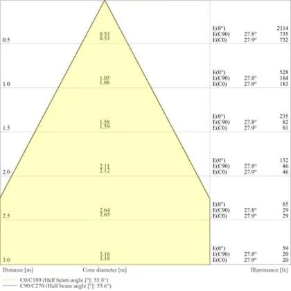 Der Abstrahlwinkel bezeichnet den Winkel, in dem das Licht aus der Lichtquelle ausgestrahlt wird. Er wird in Grad (D) angegeben. Je geringer die Gradzahl des Abstrahlwinkels ist, desto kleiner ist auch der Durchmesser des Lichtkegels, den die Lichtquelle produziert. Beispiel: Wird eine Lampe mit einem Abstrahlwinkel von 60 Grad an der Decke (2,5 m Höhe) angebracht, erzeugt sie einen Lichtkegel von 2,9 Metern Durchmesser. Hat die Lampe hingegen einen Abstrahlwinkel von 120 Grad, beträgt der Lichtkegel 8,7 Meter im Durchmesser. |