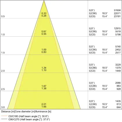 Der Abstrahlwinkel bezeichnet den Winkel, in dem das Licht aus der Lichtquelle ausgestrahlt wird. Er wird in Grad (D) angegeben. Je geringer die Gradzahl des Abstrahlwinkels ist, desto kleiner ist auch der Durchmesser des Lichtkegels, den die Lichtquelle produziert. Beispiel: Wird eine Lampe mit einem Abstrahlwinkel von 60 Grad an der Decke (2,5 m Höhe) angebracht, erzeugt sie einen Lichtkegel von 2,9 Metern Durchmesser. Hat die Lampe hingegen einen Abstrahlwinkel von 120 Grad, beträgt der Lichtkegel 8,7 Meter im Durchmesser. |