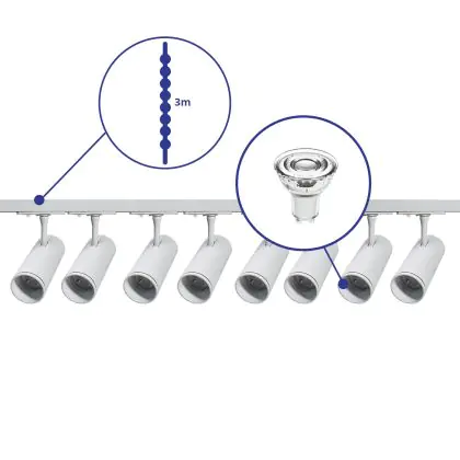 Ensemble complet Rail Monophasé Rail 3 Mètre Blanc | incl. 8x Spot + GU10 2700K 3W Dimmable + Embout, Connecteur d’Alimentation et I-Connecteur