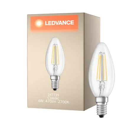 Description Ledvance Classic LED E14 Bougie Filament Claire 4W 470lm - 827 Blanc Très Chaud | Équivalent 40W