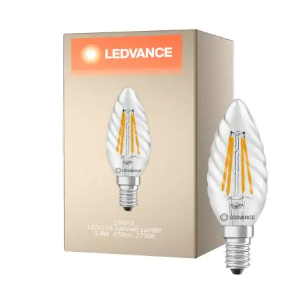 Description Ledvance Classic LED E14 TWisted Bougie Filament Claire 3.4W 470lm - 827 Blanc Très Chaud | Équivalent 40W