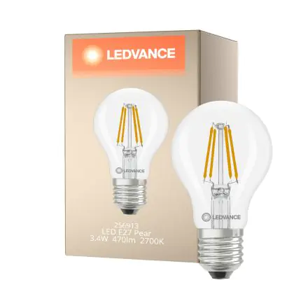 Description Ledvance Classic LED E27 Poire Filament Claire 3.4W 470lm - 827 Blanc Très Chaud | Équivalent 40W