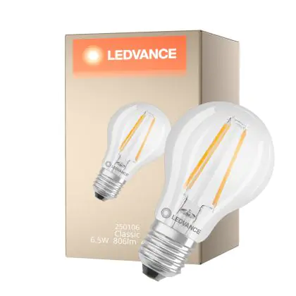 Cette ampoule Ledvance Classic LED E27 Poire Filament Claire 6.5W 806lm - 840 Blanc Froid | Équivalent 60W avec son efficacité lumineuse de lumen par watt vous permettra de profiter d’un éclairage de qualité. Avec sa durée de vie de 10000 heures, vous n’aurez pas à vous soucier de son remplacement avant quelques années.