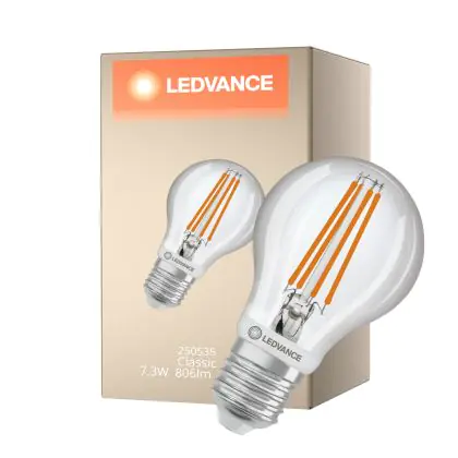 Description Ledvance Classic LED E27 Poire Filament Claire 7.3W 806lm - 827 Blanc Très Chaud | Détecteur De Mouvement Et De Lumière - Équivalent 60W