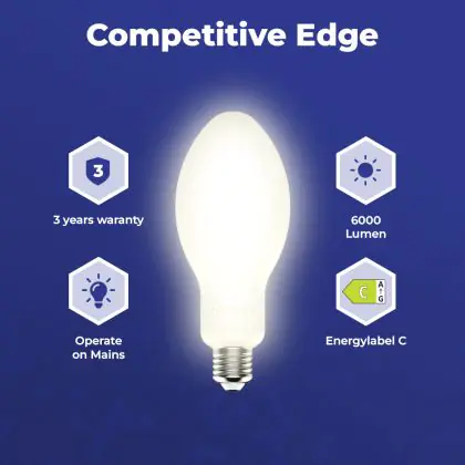 Cette ampoule Noxion LED HID Elliptique E40 36W 6000lm - 840 Blanc Froid | Équivalent 125W est le remplacement idéal des lampes à décharges classiques. Grâce à sa faible consommation d'énergie, vous pourrez économiser beaucoup d'énergie. Cette lampe Noxion ne consomme en effet que 36W en remplaçant les anciennes lampes de 125 W. Cette lampe a une classe énergétique élevée C ce qui signifie que vous pourrez faire des économies d'énergie susbtantielles. Avec sa durée de vie moyenne étendue, environ 25000 heures, vous n'aurez pas à la changer avant plusieurs années.