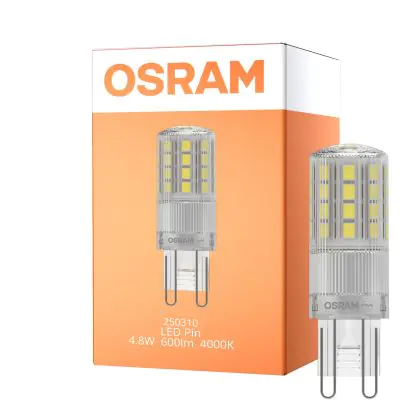 Les ampoules LED G9 sont des petites ampoules en forme de capsule. Ces ampoules vous permettront de remplacer vos ampoules à incandescence et à économies d’énergie sans modification de votre installation actuelle. Cette ampoule Osram LED Capsule G9 Claire 4.8W 600lm - 840 Blanc Froid | Équivalent 48W est la variante à LED de l’ampoule G9 classique. Cette ampoule Osram se caractérise par sa faible consommation d’énergie. Elle n’utilise que 4.8 W, pour fournir une lumière de haute qualité. Cette ampoule LED est produite par Osram, une marque réputée en matière d'éclairage. Vous êtes donc assuré de sa qualité.