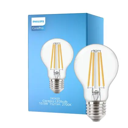 Description Philips Corepro LED Ampoule E27 Poire Claire 10.5W 1521lm - 827 Blanc Très Chaud | Équivalent 100W